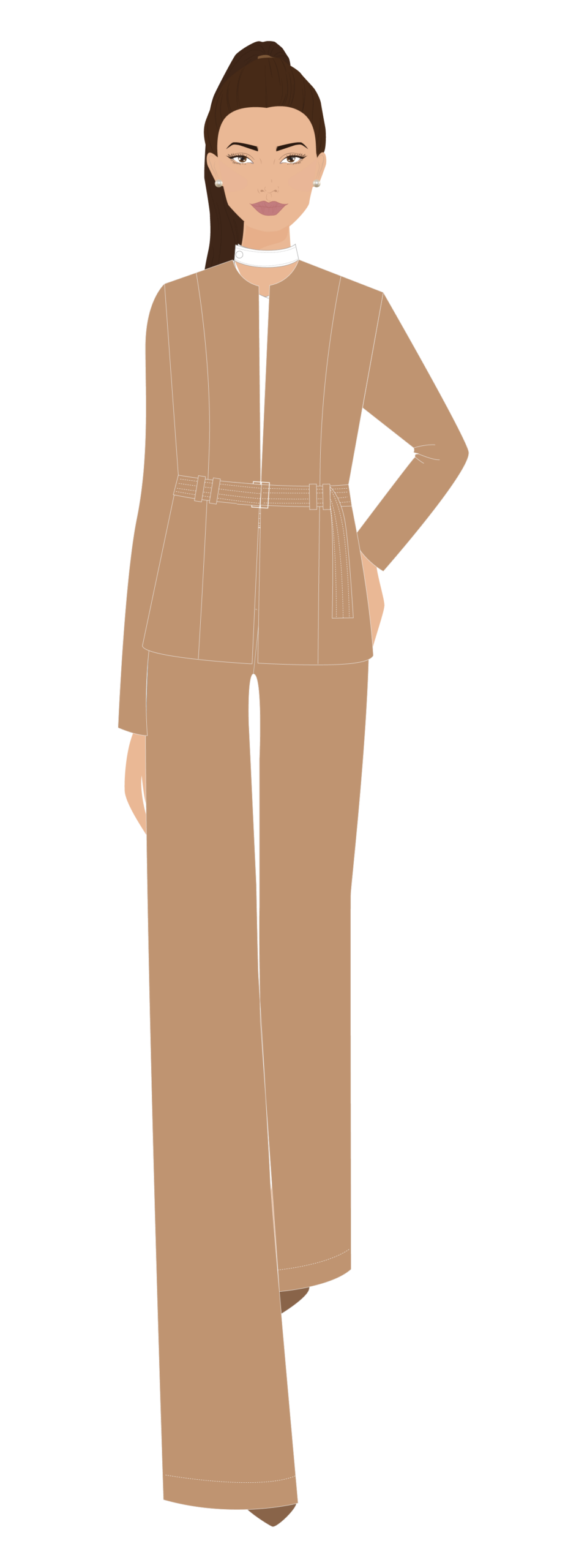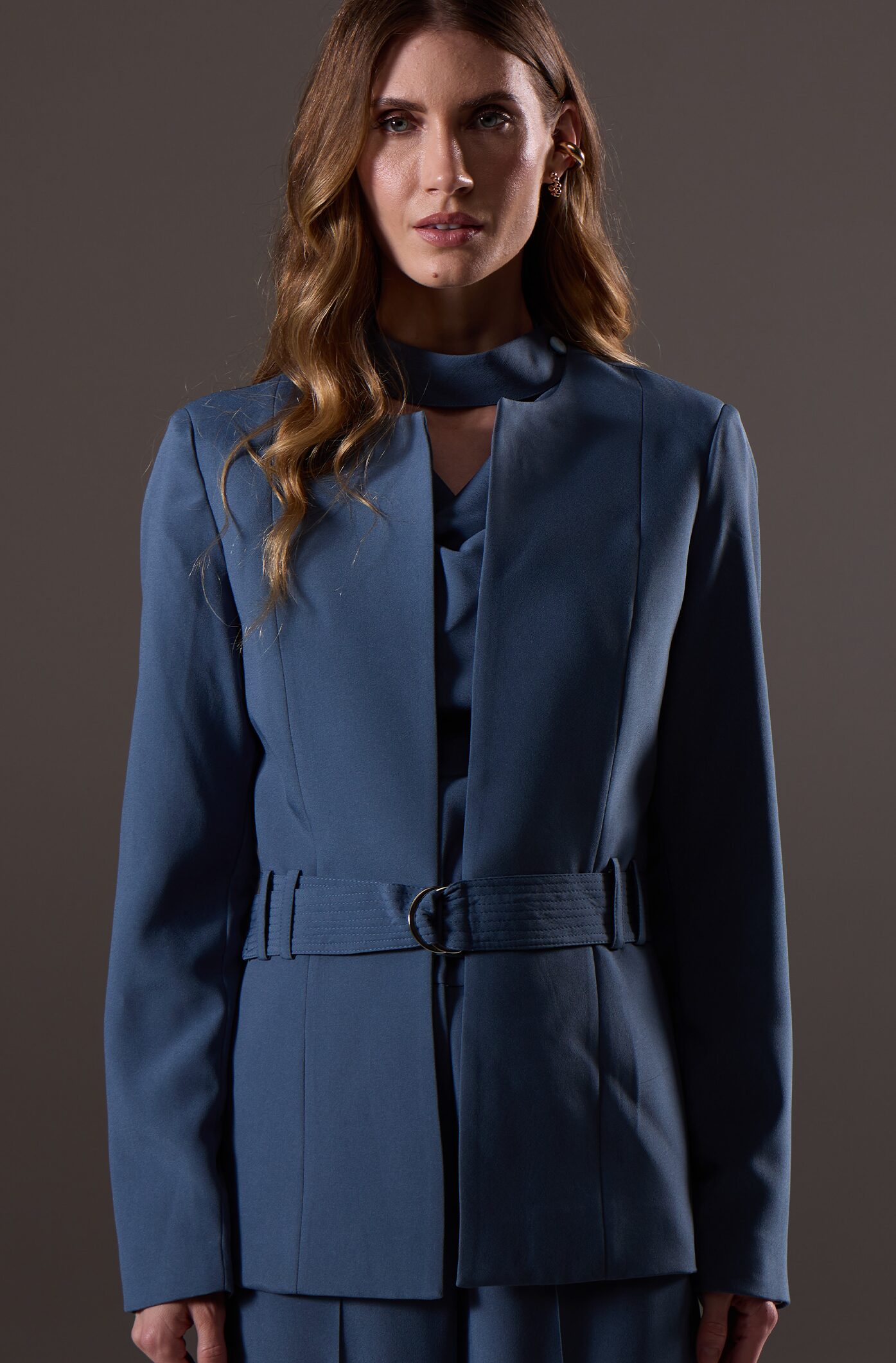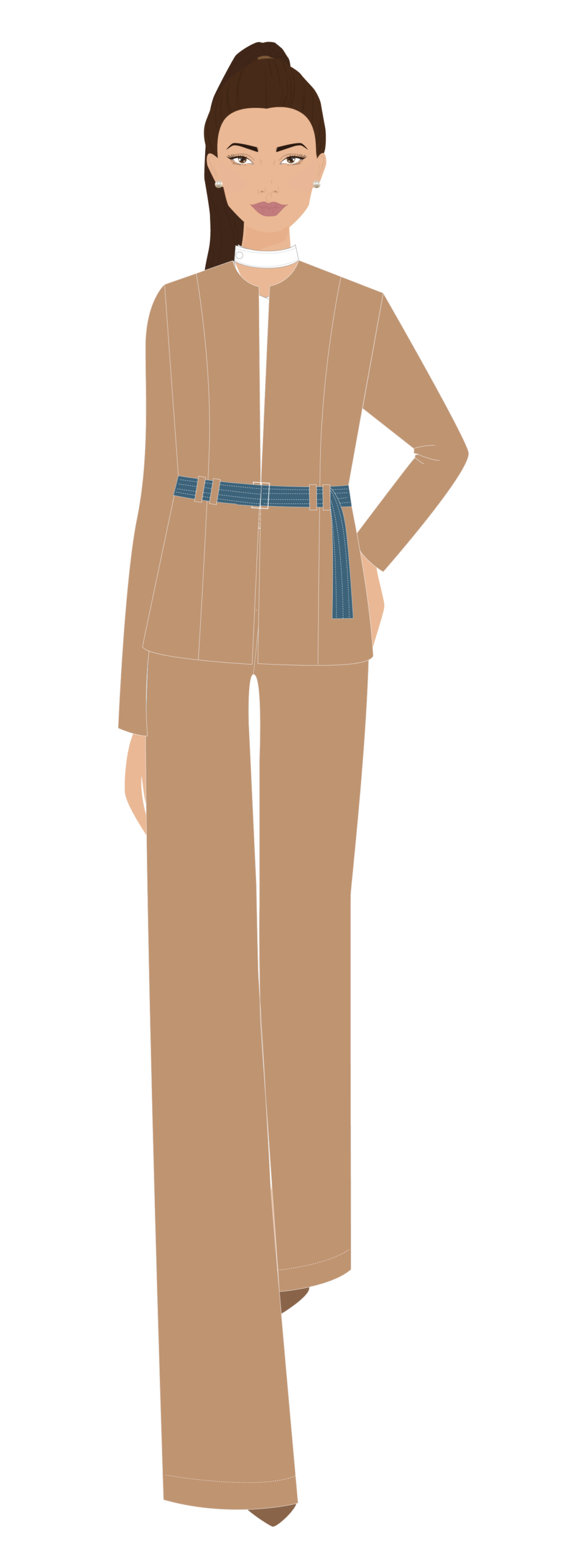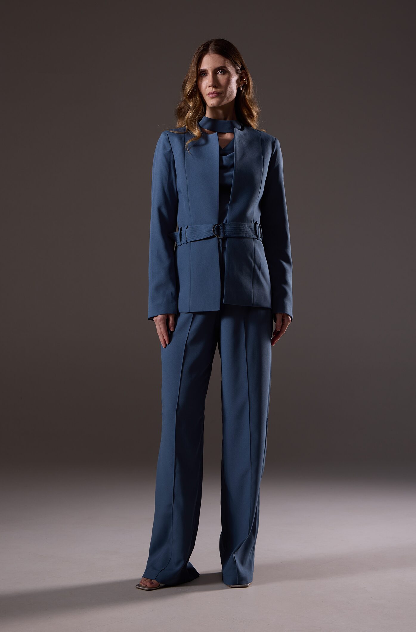 Os cortes foram pensados para unir elegância e modernidade. Blusas com linhas assimétricas e blazers sem gola, marcados por um cinto na altura da cintura, trouxeram uma linguagem de design que dialoga com o universo da moda e da alfaiataria contemporânea.
