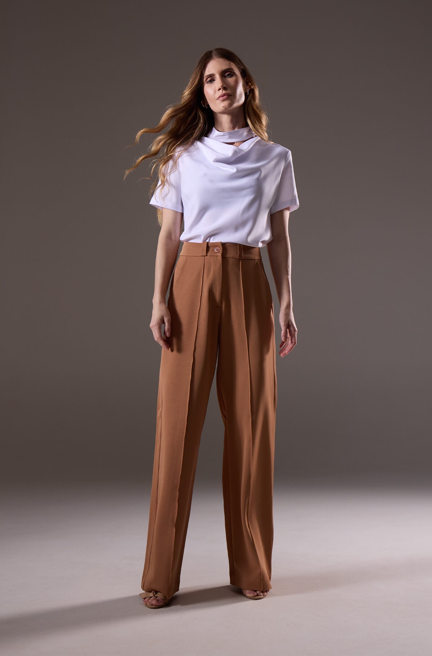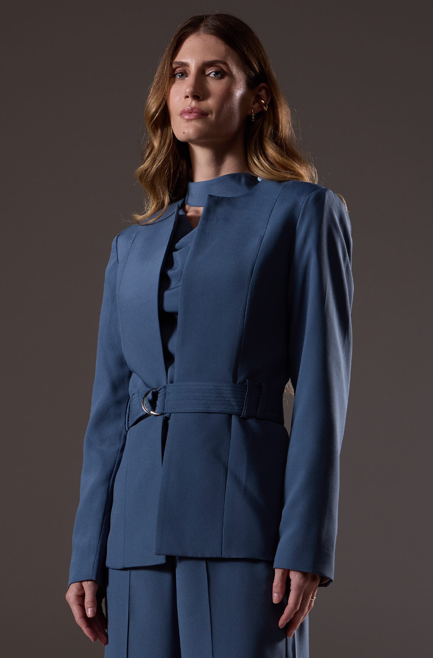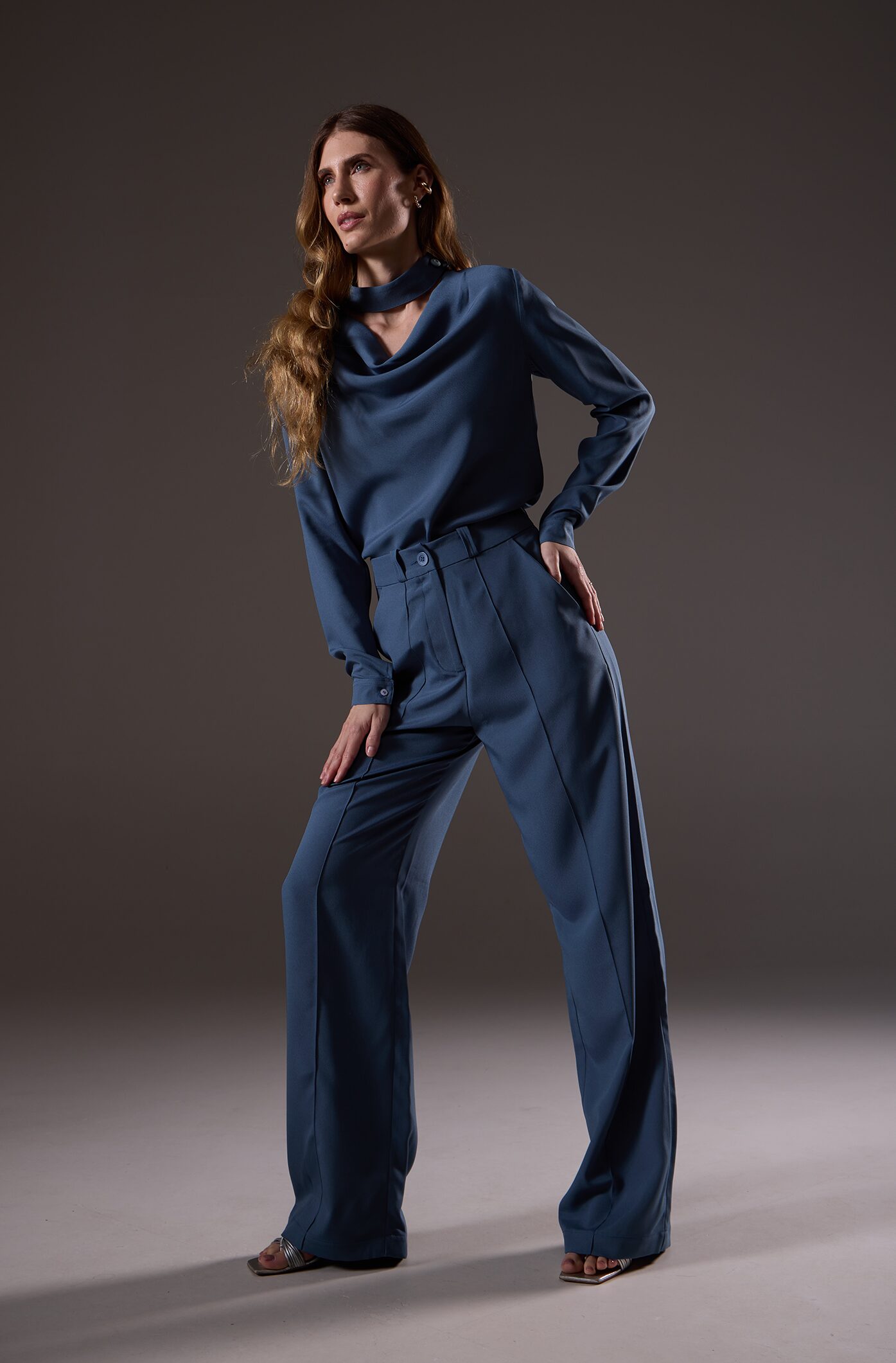 Os cortes foram pensados para unir elegância e modernidade. Blusas com linhas assimétricas e blazers sem gola, marcados por um cinto na altura da cintura, trouxeram uma linguagem de design que dialoga com o universo da moda e da alfaiataria contemporânea.